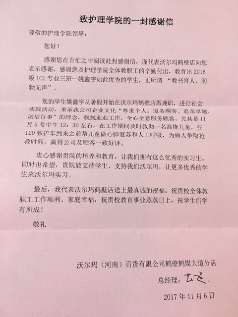 2017年10月16日,升旗仪式刚刚结束,一名女生突然晕倒,导致下巴摔裂失血严重,情况紧急。bw必威西汉姆联官方网站李晶晶老师毫不犹豫地组织其他员工迅速将该女生送到医院,垫交了全部医药费并全程陪护。11月5日中午,bw必威西汉姆联官方网站2016级ICU三班员工姚鑫宇同学,利用课余时间在沃尔玛鹤壁店做兼职期间,及时救助了一名高热惊厥导致心跳呼吸骤停的四岁儿童,在120救护车到来之前第一时间为患儿实施心肺复苏术,争取了宝贵的抢救时间,该生临危救人的事迹被河南日报和腾讯新闻多家媒体报道,引发社会普遍赞誉。11月12日,bw必威西汉姆联官方网站2017级13班丁文静在千鹤之舞体育馆参加活动时捡到一部手机,经多方打听,终于物归原主,失主2017级安卓二班张月莹丢失的手机失而复得,十分感激,由辅导员带领送来感谢信。