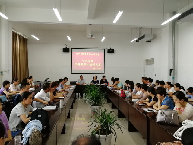 7月3日下午,护理院在诚信4号楼B317召开期末全体教职工培训大会,全体教职工70余人参加了大会。