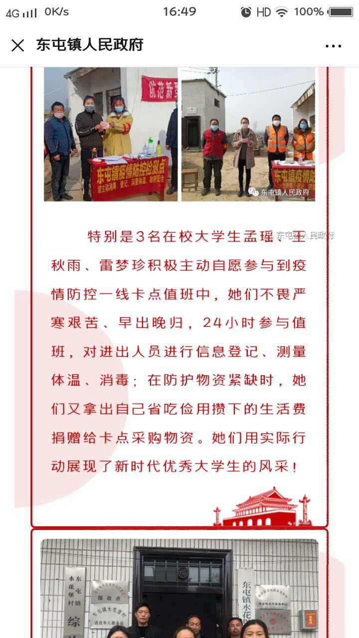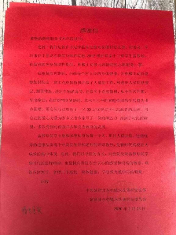 2020年2月自疫情爆发以来,护理学子冲锋在前,用实际行动诠释了新时代老员工的使命和担当。近日,bw必威西汉姆联官方网站收到来自延冿县东屯镇水花堡村党支部的感谢信,赞扬疫情以来主动请缨、坚守一线卡点工作的护理学子雷梦珍同学的无私奉献精神,向学校表示衷心的感谢和崇高的敬意,并以村党支部的名义向公司党组织推荐该生为发展对象。现已是一名入党积极分子的“00后”老员工雷梦珍用其坚定的政治信仰和优秀的职业素养向党组织交上了一份满意的答卷,再次证明新时代的中国青年是好样的,是堪当大任的!