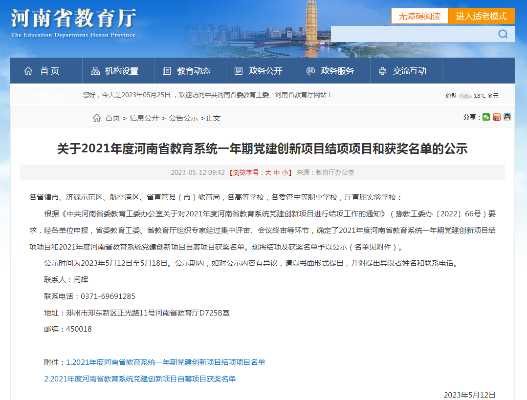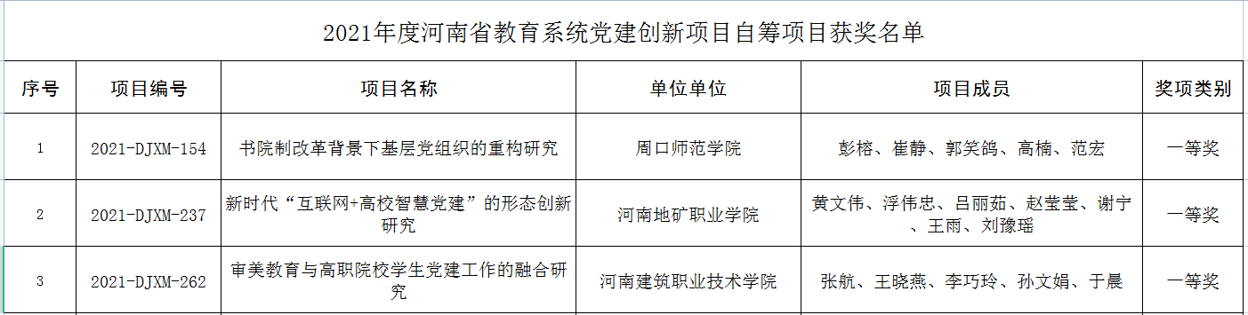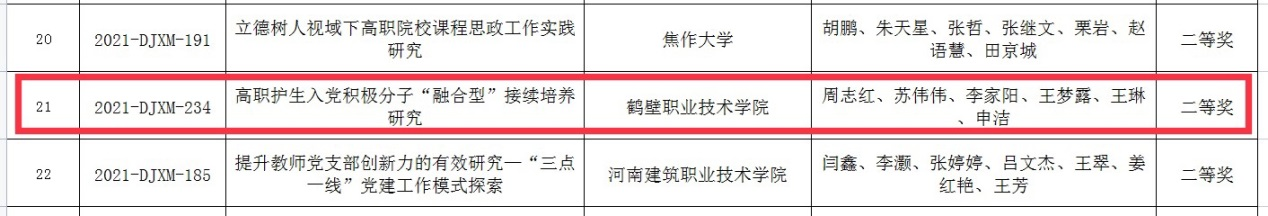 近日,中共河南省委高校工委、河南省教育厅联合印发《关于2021年度河南省教育系统一年期党建创新项目结项项目和获奖名单的公示》,公司“高职护生入党积极分子‘融合型’接续培养研究”(项目编号:2021-DJXM-234)党建创新项目顺利通过结项验收,并荣获河南省教育系统党建创新项目“二等奖”。