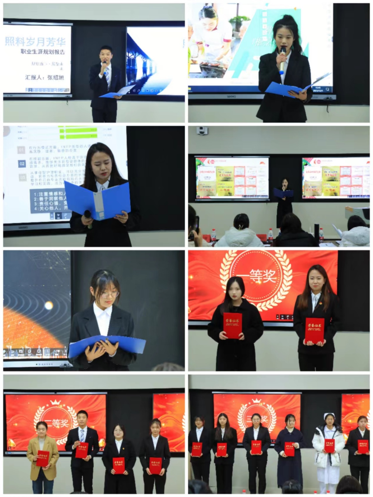 大赛以“筑梦青春志在四方,规划启航职引未来”为主题,设有成长赛道和就业赛道。参赛选手围绕自我认知、职业认知、职业决策、计划实施等方面进行职业规划PPT设计展示,充分展示出护理学子锐意进取的良好的精神风貌。在选手自我展示后,评委老师结合选手的陈述与相关职业的就业实际,从生涯目标与规划、职业素质与能力、行动计划与调整等方面进行打分,对选手们的综合素质、未来规划的清晰程度与现场应变能力进行考察。