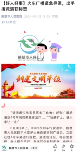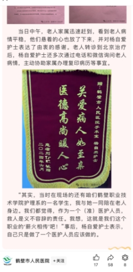 鹤壁市人民医院公众号对耿淑奇参与救死扶伤事迹的报道