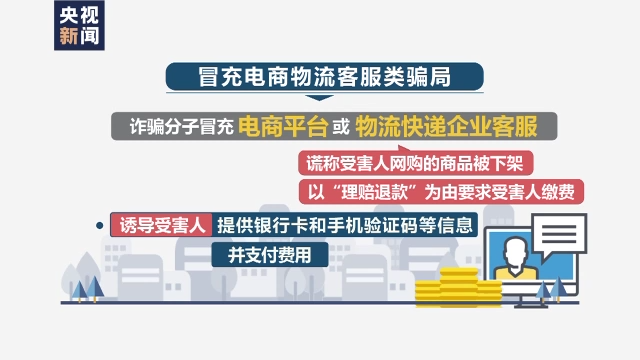 诈骗分子冒充电商平台或物流快递企业客服,谎称受害人网购的商品被下架,以“理赔退款”为由要求缴费,诱导受害人提供银行卡和手机验证码等信息,并诱导受害人支付费用。