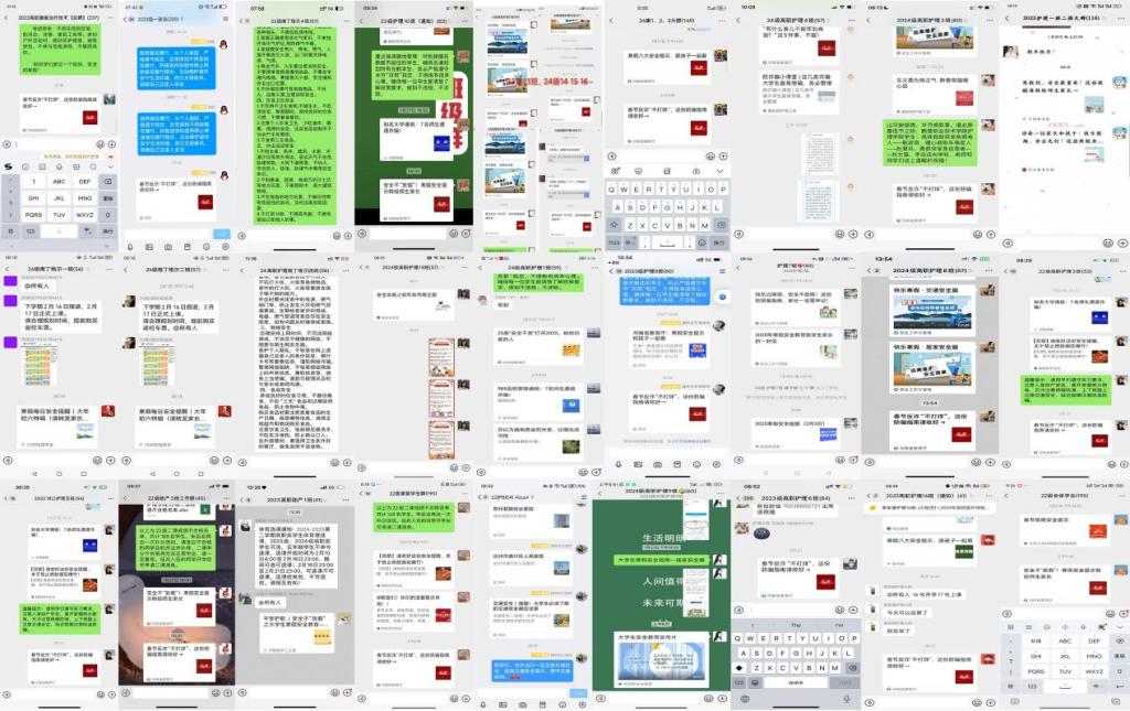 辅导员充分利用班级群这一便捷渠道,每周定时发送安全提醒信息。发送的信息形式丰富多样,既有简洁明了的文字说明,直观生动的视频案例,也有权威详实的安全知识链接,确保以员工易于接受的方式传递安全信息。信息内容涵盖交通安全、消防安全、网络安全以及防诈骗等多个安全领域。