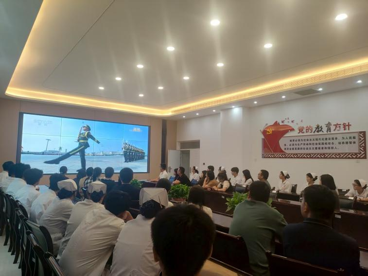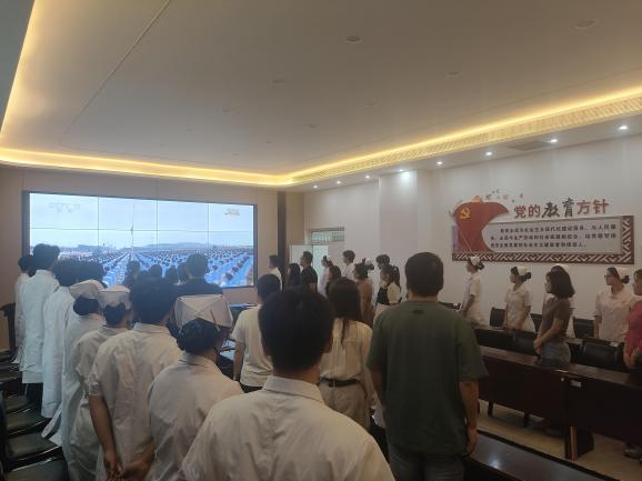 上午9点,师生们准时到达会议室,怀着崇敬与激动的心情等待阅兵开始。阅兵式正式开始,当五星红旗冉冉升起,激昂的国歌声在天安门广场响起时,会议室里的师生们全体起立,齐声高唱国歌,目光坚定地注视着屏幕 。