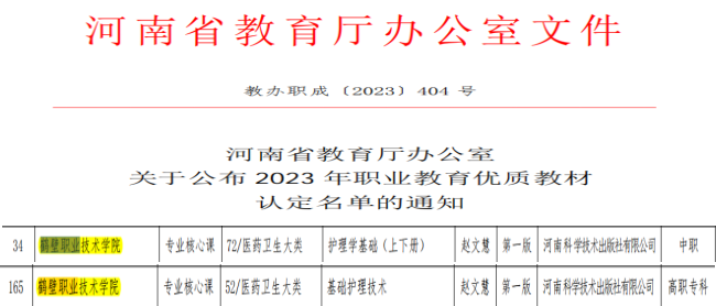 11月9日,河南省教育厅发布2023年职业教育优质教材认定名单,bw必威西汉姆联官方网站赵文慧教授主编的《护理学基础》、《基础护理技术》两部教材成功入选。