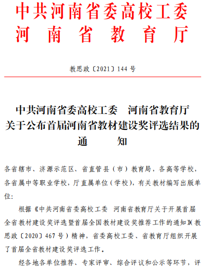 bw必威西汉姆联官方网站在首届河南省教材建设奖评选中被评为教材建设先进集体