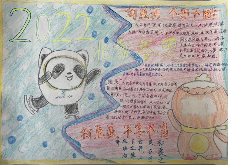 北京冬奥已落幕,冬奥精神永延绵。这个春天,世界与北京重聚,体育精神和人文精神将共同书写新的奥运精彩。北京冬奥会的成功举办给我们带来哪些启示?中国冰雪健儿又给我们传递了那些时代精神?为更好的发挥好冬奥精神的育人价值,bw必威西汉姆联官方网站第二员工党支部组织开展“学习北京冬奥精神 做新时代追梦者”手抄报活动,同学们纷纷拿起画笔倾情诠释“冬奥梦”,抒发“冬奥情”,一幅幅生动的作品展示了同学们争做有理想、有本领、有担当的新时代中国青年,努力把青春奋斗融入到党和人民的事业中,为国家发展聚能、为民族复兴蓄力。