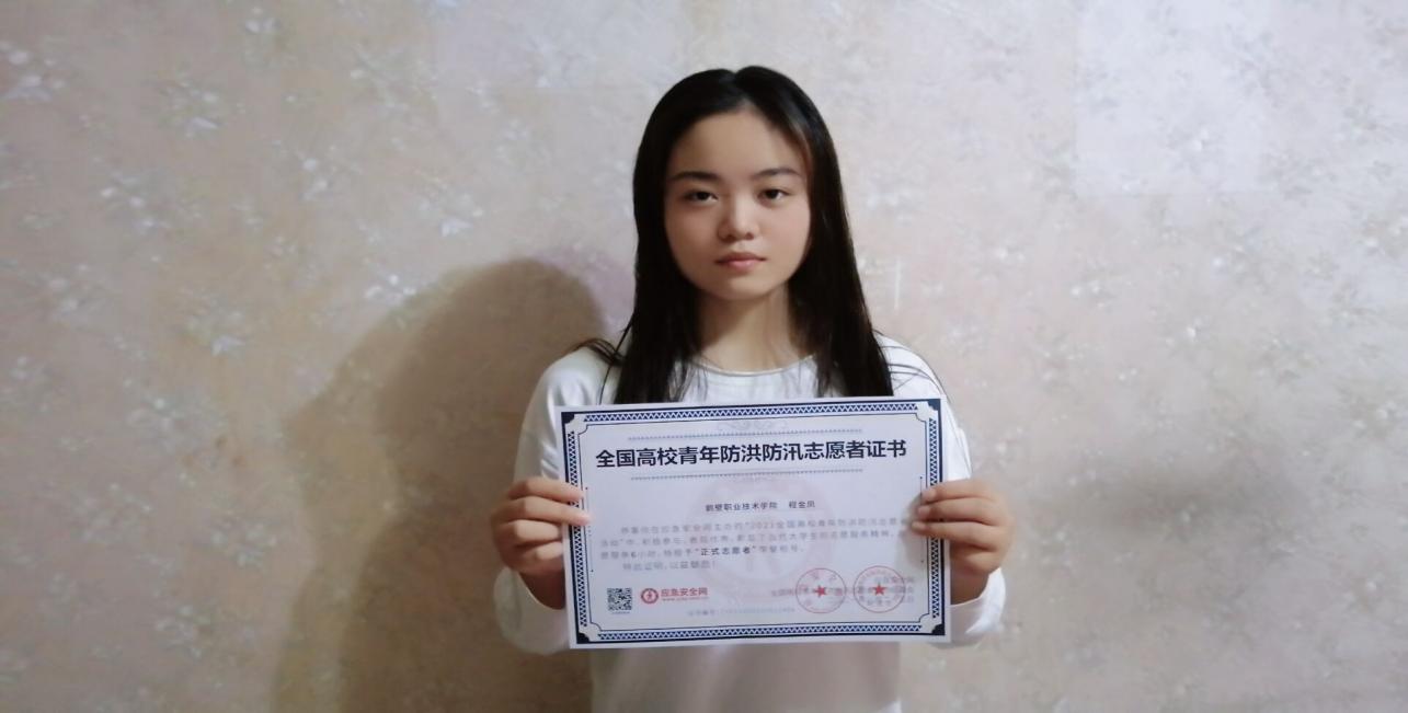 2019级护理18班 程金凤(预备党员) 7月25日 在郑州参加防洪防汛志愿活动获得全国高校青年防洪防汛志愿者证书。