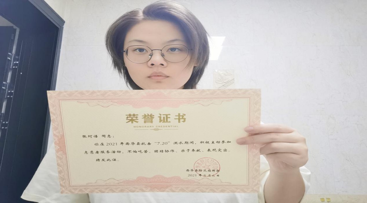 2019级护理ICU1班 张珂语(积极分子) 7月20日 在郑州参加防洪防汛志愿活动获得防洪防汛荣誉证书。