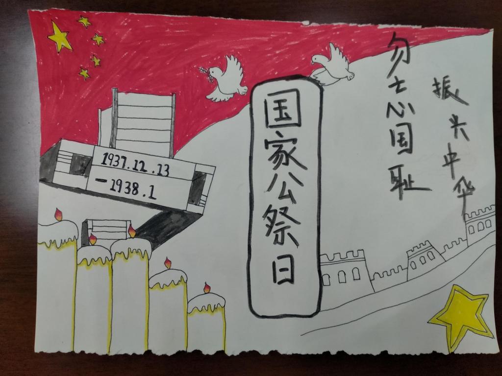 在一张张手抄报里同学们穿过时间的洪流,看到了曾经苦难的中华民族,了解了受压迫的屈辱历史,以画笔为武器,用精湛的画艺描绘出对南京大屠杀历史的理解与感悟,慷锵有力的文字书写出对和平的向往以及对祖国未来的美好憧憬。