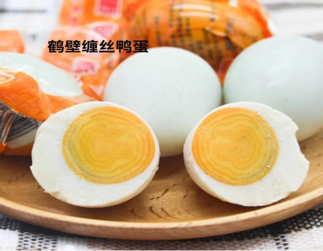 鹤壁缠丝鸭蛋的蛋黄大,且呈鲜红色,煮熟后用细线拉成两半,不仅蛋清可层层剥离,最奇妙的是蛋黄内有一圈圈红黄相间的色环,即一环红色,一环黄色,一直缠到蛋黄的核心,缠丝鸭蛋因此而得名,素有“金丝伴银线,精品缠丝蛋”之誉。缠丝鸭蛋鲜蛋煮食没腥味,口感很筋,像似瘦肉,味道鲜美。用盐腌制后,蛋清洁白,蛋黄鲜红艳丽,呈沙性,出油多,口感极佳。