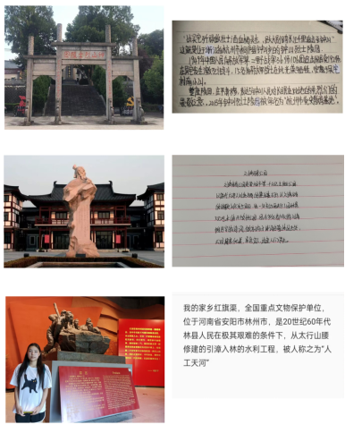 在本次活动中,有的同学通过讲述家乡的“人工天河”红旗渠,展现出河南人民自力更生、艰苦创业、团结协作、无私奉献的精神。有的同学通过介绍钟山烈士陵园,使我们铭记一段壮烈的红色历史。有的同学通过讲述家乡的“河朔胜景”大伾山的历史由来,使我们了解到了家乡的独特魅力和丰富的文化底蕴,其深刻的历史文化内涵让人回味无穷,流连忘返。有的同学则讲述家乡的英雄人物岳飞,他的精神象征着中国儿女矢志不渝的爱国情怀。通过一山一市一物一人的描写,更好的揭示当地独特的历史和文化遗产,更好的坚定文化自信,推动文化的传承,承担起新青年、新时代的文化使命。