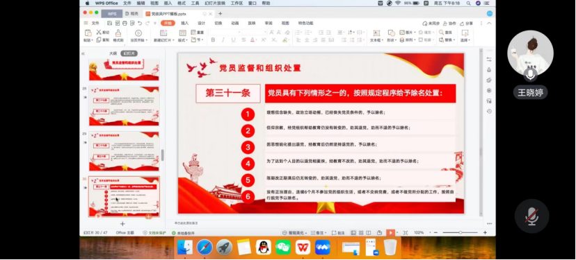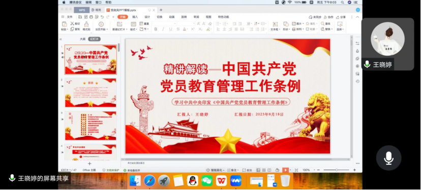 会上,支部副书记王晓婷同志带领大家集体学习了《中国共产党党员教育管理工作条例》,结合支部实际情况重点学习了《条例》的总则、学习贯彻习近平新时代中国特色社会主义思想、党员教育基本任务、党员日常教育管理主要方式、党员监督和组织处置、党员教育管理信息化等章节内容。
