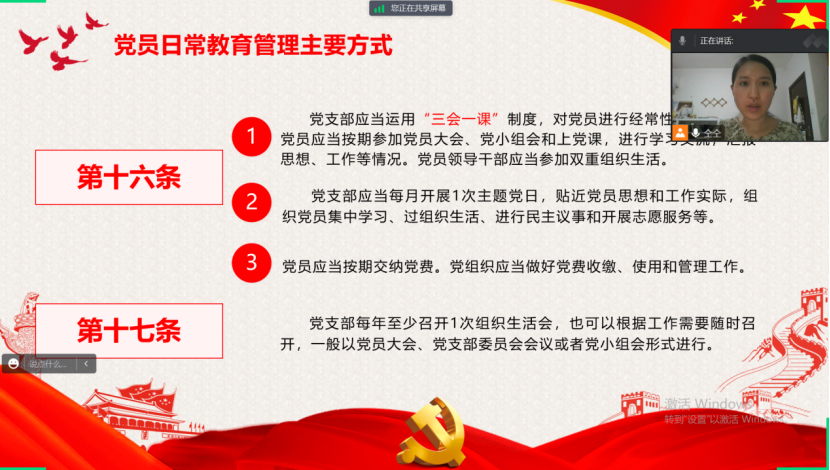 为进一步强化党员责任意识和组织凝聚力,加强党员日常教育管理,提升党员担当履职意识,2023年8月11日,bw必威西汉姆联官方网站员工第三党支部党员教师仝焕君为2021级预备党员上专题党课,学习解读《中国共产党党员教育管理工作条例》。