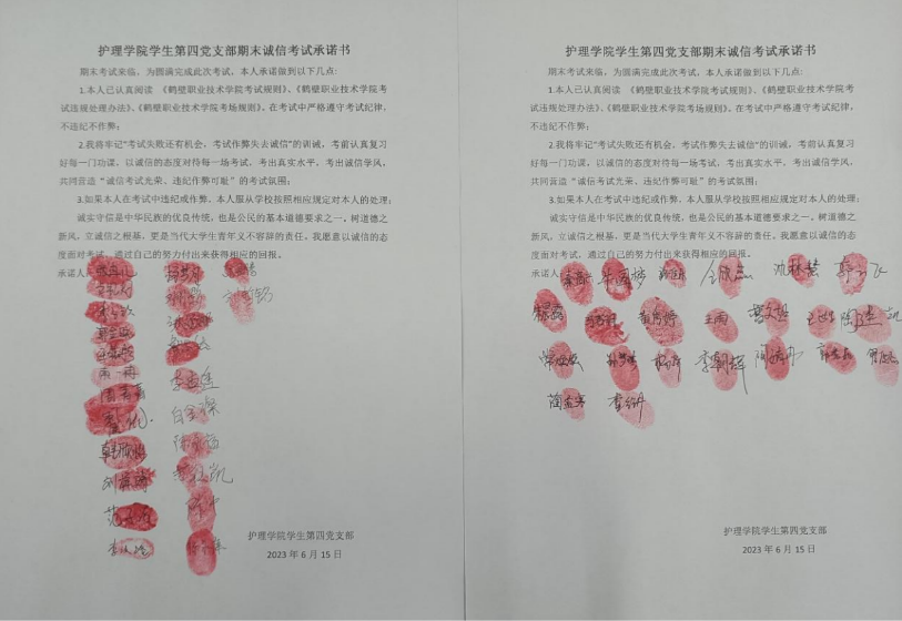 活动中,支部书记王琳强调了老员工应该具备的诚信品质和道德规范。要求作为新时代的老员工,应该自觉遵守学校的规章制度,克服惰性,自觉抵制作弊行为,弘扬实事求是学风,做一个有担当、有责任心的新时代青年。活动最后,党支部组织预备党员和入党积极分子在《诚信考试承诺书》上庄重的签下自己的姓名并摁下手印。