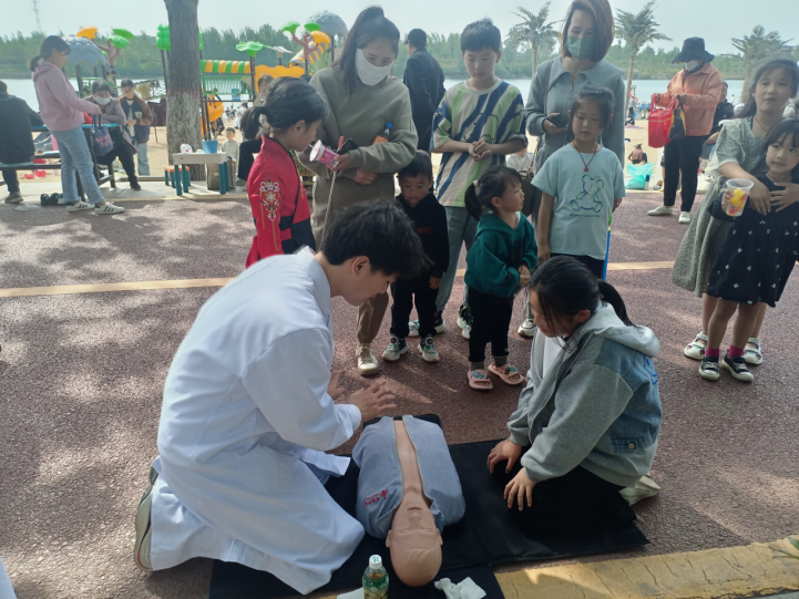 活动现场急救小分队利用模拟人对市民开展了单人徒手心肺复苏术培训。培训采用现场演示和互动练习相结合的方式,带队教师和志愿者借助模拟人对生命指征判断、胸外按压、开放气道、人工呼吸等操作要领做了详细讲解和示范。随后,现场有兴趣的市民进行了实战练习,志愿者们手把手教学,耐心指导急救的操作动作和要领。活动现场的市民纷纷表示本次培训非常贴近生活,意义重大也收获满满,如果生活中遇到此类突发事件,会更有信心能够紧抓黄金抢救时间,及时实施正确的心肺复苏术以挽救生命。