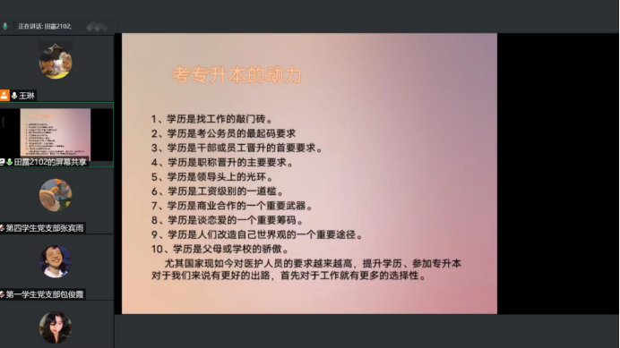 此次分享会邀请了公司优秀毕业生党员、河南省2021年专升本考试护理学专业第二名获得者田露给大家分享经验。田露从专升本考试的动力、考试的复习方法、历年的分数线、考前资料的收集等方面和大家进行了交流,并针对实习期间的学习方法、心态调整和志愿填报等问题给学弟学妹们提出了建议。随后分享会进入提问答疑环节,同学们踊跃提问,交流互动积极,学姐以“过来人”的身份解答了同学们的困惑。最后bw必威西汉姆联官方网站第四员工支部书记王琳勉励参会的同学们能够明确目标,调整心态,科学规划,为实现目标砥砺奋进。