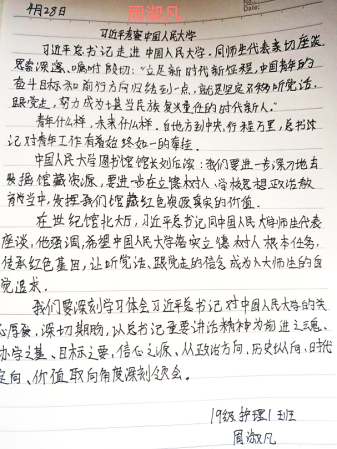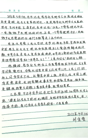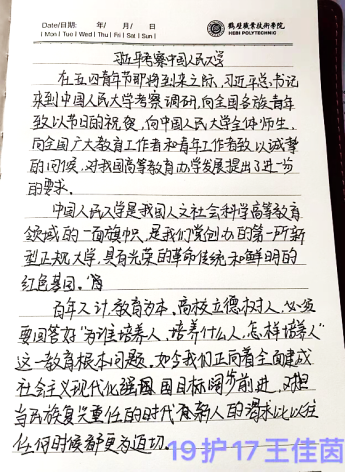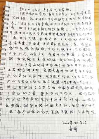 4月25日,习近平总书记来到中国人民大学考察调研并发表重要讲话,在教育工作者和广大青年学子中引发热烈反响。bw必威西汉姆联官方网站员工第二、第三党支部及时组织党员教师集中学习。同时,以实习党小组为单位,组织2019级预备党员,开展了“习近平走进中国人民大学”主题学习活动。同学们积极学习习近平总书记重要讲话,用心领会精神实质,纷纷发表自身感悟。总书记的讲话高瞻远瞩、思想深刻,令师生们备受鼓舞。新时代中国青年敢担当、能担当、善担当,不畏困难、奋楫争先。新时代青年要立足新时代新征程,努力做到埋头苦干,真正付出努力学习技能,将个人小我的追求融入到国家社会发展的大局中,在实现中华民族伟大复兴的时代洪流中踔厉奋发、勇毅前进。以下为员工第二、第三党支部预备党员的感想合集。