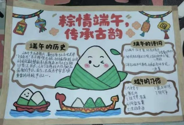 同学们围绕端午节起源、习俗与传说等内容,以创意为笔、以色彩为墨,精心绘制出一幅幅主题鲜明、绚丽多彩的手抄报:龙舟竞渡的磅礴气势跃然纸上,憨态可掬的粽子造型栩栩如生,工整的文字诉说着屈原的爱国故事与端午驱邪纳吉的传统寓意,让端午文化在笔尖灵动绽放。在手工制作五彩绳环节,同学们一边细致讲解其祈福辟邪的文化寓意与编织技巧,一边相互协作,将丝线巧妙缠绕、打结,化作色彩斑斓的吉祥饰物。大家佩戴亲手制作的五彩绳,寄托健康平安的美好期许,在沉浸式实践中感受传统民俗魅力,处处洋溢着团结互助与文化传承的温馨氛围。