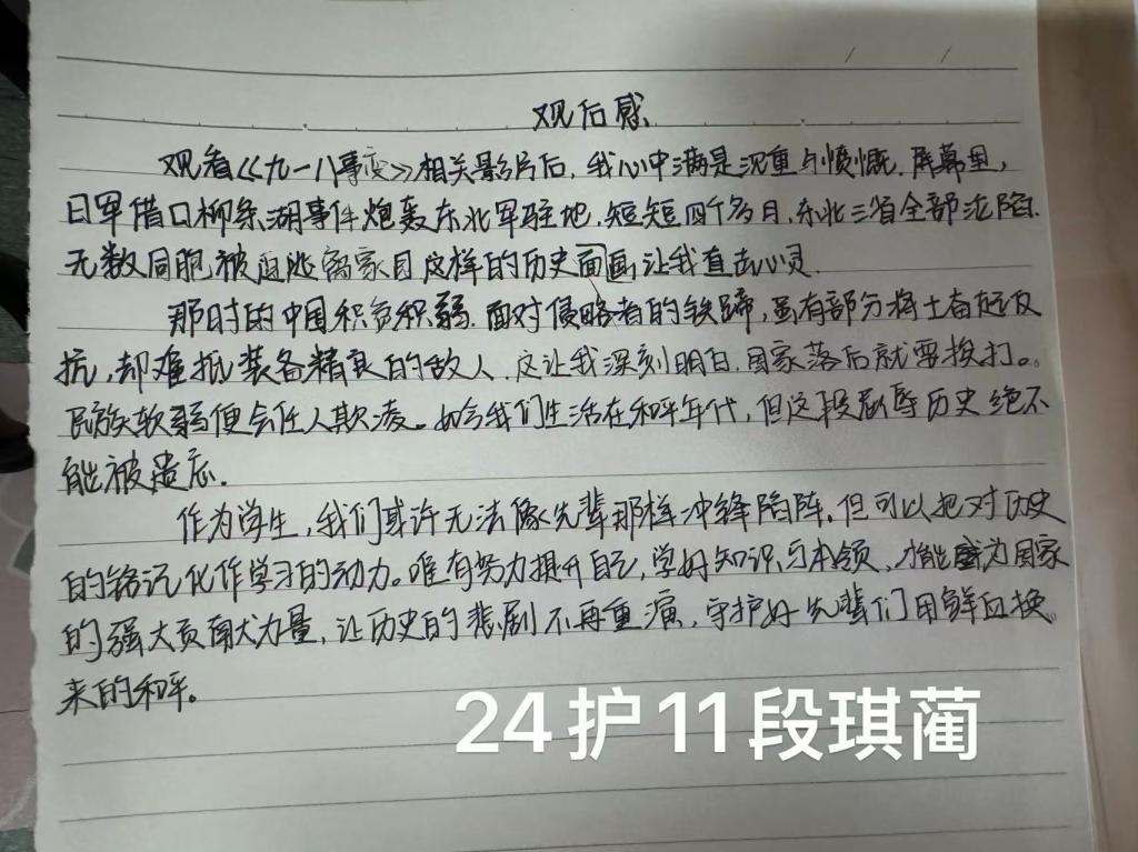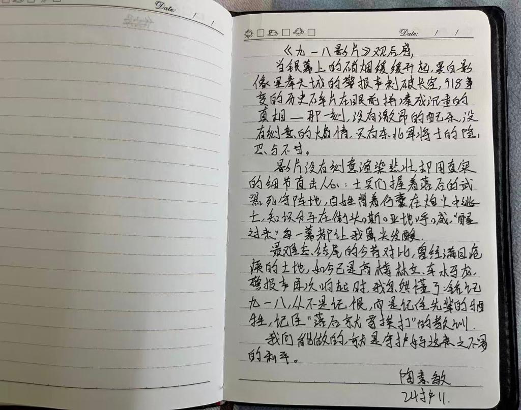 在活动中,同学们自行观看了《九一八事变真相》、《东北抗日联军》、《南京!南京!》等历史影片。观影过程中,随着影片画面的推进,大家仿佛穿越到那个战火纷飞的年代,看到了日本侵略者的残暴行径,也看到了中国军民奋起反抗的英勇无畏。同学们神情凝重,深刻感受到百年前国家蒙辱、人民蒙难的惨痛境遇。一段段直观的影像让抽象的历史变得鲜活可感,让“铭记”不再是口号,而是刻入员工们内心的情感共鸣。观影结束后,大家纷纷拿起笔,撰写观后感。在字里行间,同学们抒发着对历史的深刻感悟,既有对历史的敬畏,更有对责任的担当。有人感慨“落后就要挨打,吾辈当自强”,立志要刻苦钻研,以自身能力担当守护人民健康。有人致敬抗日先烈,是他们的牺牲换来了如今的和平,我们定会铭记历史,传承精神。一篇篇观后感,既是对历史的回望,也是对自身责任的明确,更是爱国情怀的生动表达。