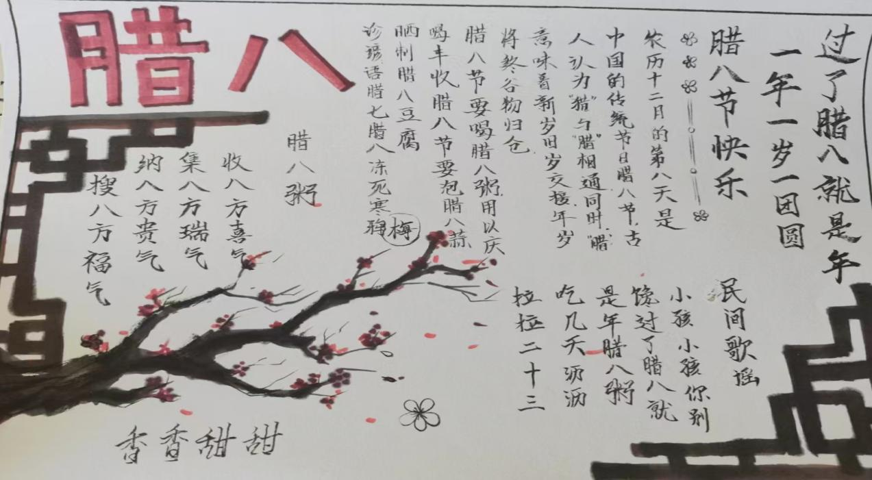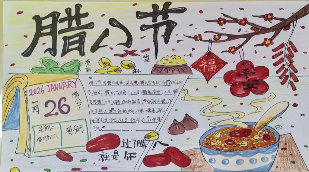 活动设置“青春绘腊八”创意环节,鼓励同学们以绘画、手抄报等形式诠释腊八文化。作品融汇民俗场景与现代元素,结合诗词谚语与节日影像,展现传统与青春的创意碰撞。同学们在交流点评中共享灵感,使腊八文化成为可感、可传播的生动符号。