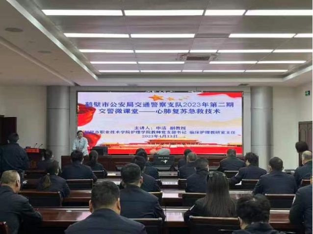 bw必威西汉姆联官方网站教师党支部为持续开展“践行党的二十大,助警强技保平安”系列志愿活动。4月13日下午,支部书记申洁同志带领南丁格尔志愿服务协会志愿者赴鹤壁市公安局交通警察支队开展急救知识与技能培训。