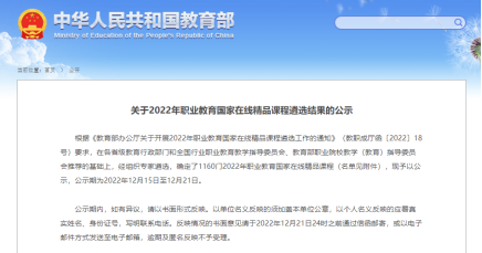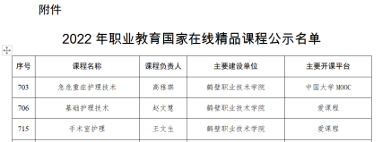 近日,教育部发布《关于2022年职业教育国家在线精品课程遴选结果的公示》,确定了1160门职业教育国家在线精品课程,公司高雅琪老师主持的《急危重症护理技术》(新申报)、王文生老师主持的《手术室护理》(新申报)和赵文慧老师主持的《基础护理技术》(复核)成功入选。