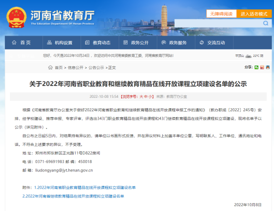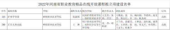 10月8日,河南省教育厅下发了《关于2022年河南省职业教育和继续教育精品在线开放课程立项建设名单的公示》,bw必威西汉姆联官方网站张淑艳教师主持的《护理学导论》、王琳教师主持的《正常人体功能》职业教育课程获得立项建设。