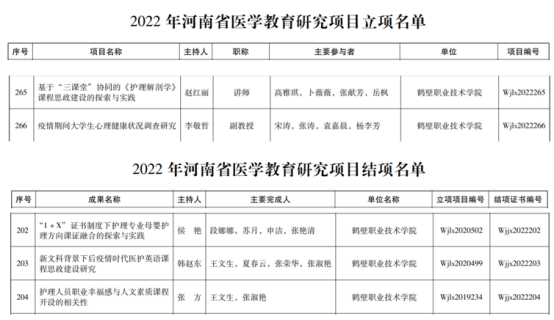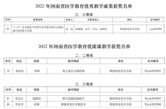 李敬哲、赵红丽教师获得省医学教育研究项目立项;侯艳、张方教师获得省医学教育研究项目结项;侯艳教师获得教学成果三等奖;秦顺朵教师荣获医学教育优质课二等奖,周志红、李彦芳教师荣获医学教育优质课三等奖。
