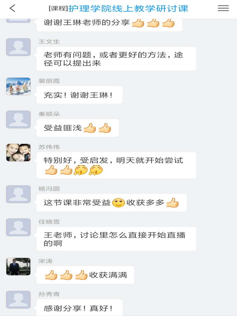 活动结束后,教师就教学平台的使用、课程资源的建设、在线课堂的实施等问题开展了研讨,相互交流,分享经验。通过本次线上集体教研活动,为教师间交流学习架起了新的桥梁,为老师们线上教学能力的进一步提升奠定了更加扎实的基础。