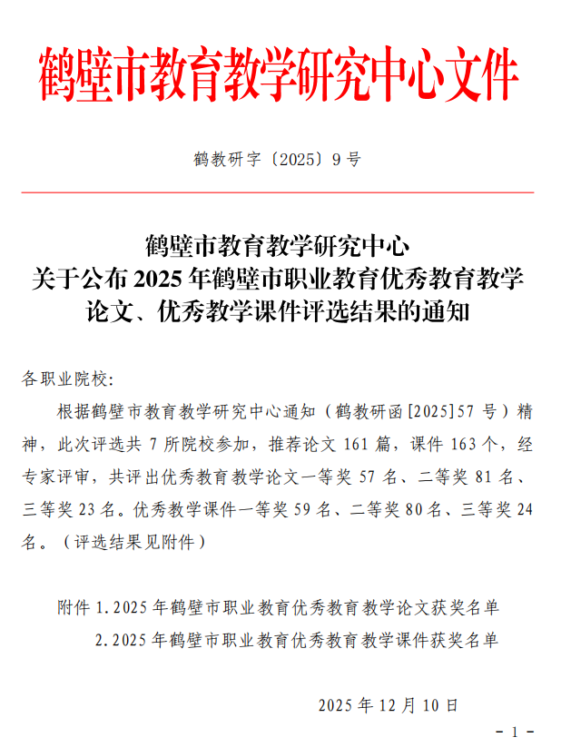 近日,鹤壁市公司产品研究中心公布了2025年鹤壁市职业教育优秀公司产品论文与优秀教学课件评选结果。公司在此次评选中表现突出,累计荣获多项奖励,成果丰硕。