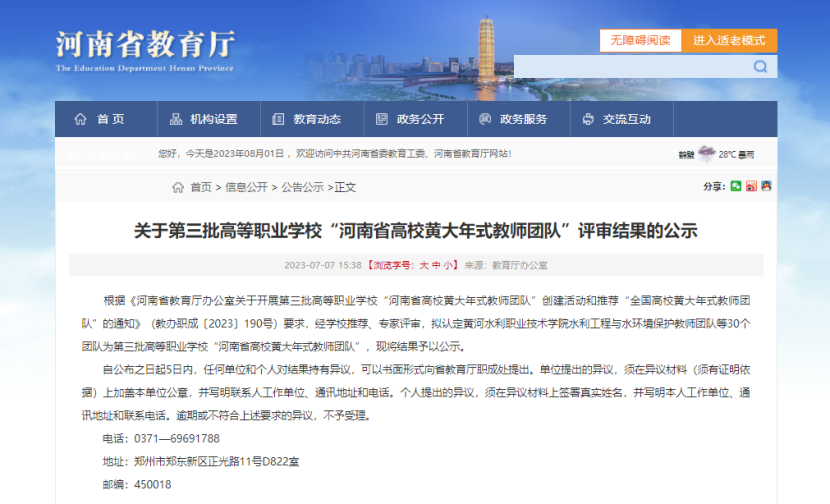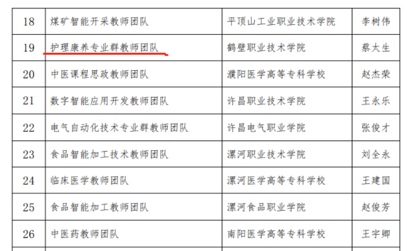 近日,河南省教育厅发布了《关于第三批高等职业学校“河南省高校黄大年式教师团队”评审结果的公示》,共有30个团队入选,公司护理康养专业群教师团队成功入选。