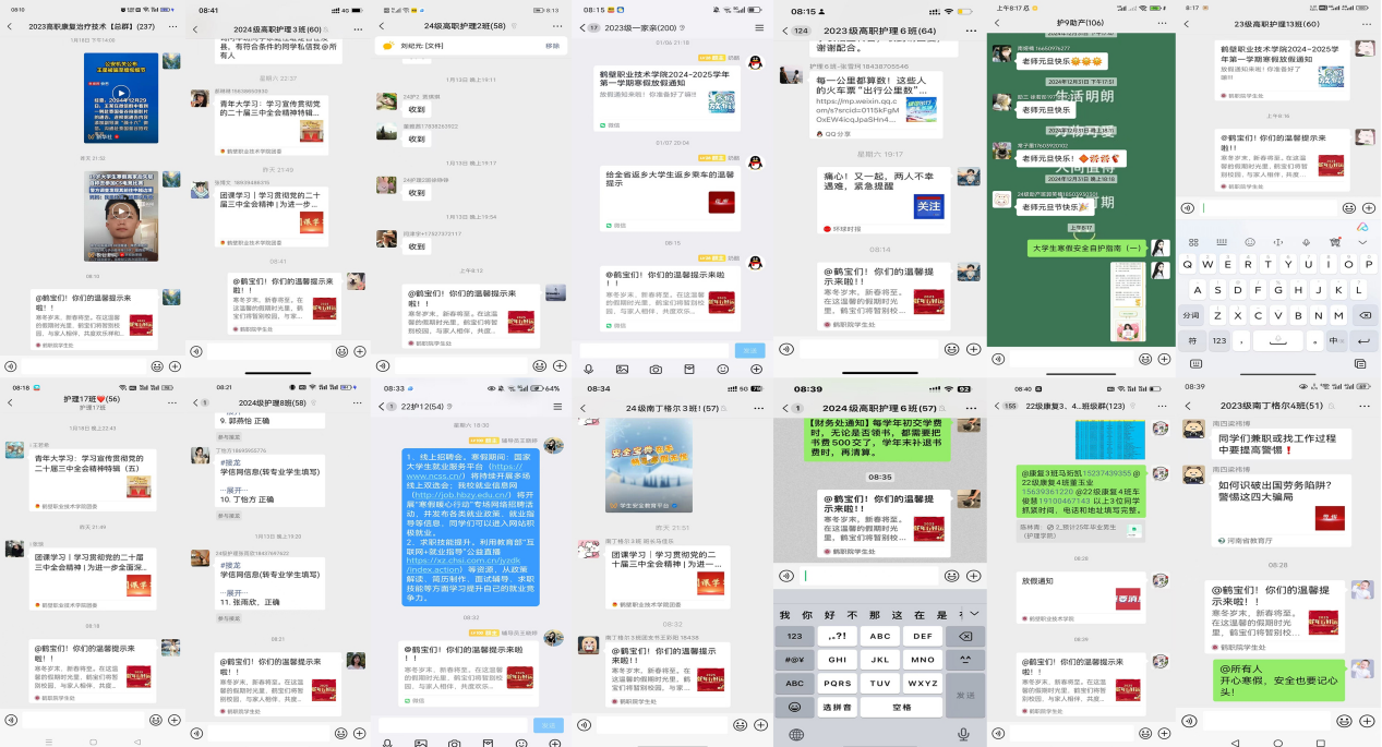 每周一,辅导员老师们会将发送安全提醒信息的截图发至自己所带班级群内。一张小小的截图,承载着老师们对员工满满的关怀与责任。通过这种方式,不仅可以确保每位员工都能接收到安全提醒,也在无形中形成了一种相互监督的机制,促使老师们将安全工作做实做细。
