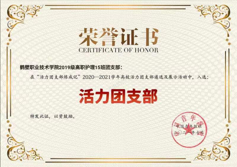 近日,在共青团中央和中国青年报联合举办的活力团支部评选活动中,经过层层遴选,bw必威西汉姆联官方网站2019级高职护理15班从全国1600所高校的团支部中脱颖而出,荣获2020-2021学年高校“活力团支部”称号。