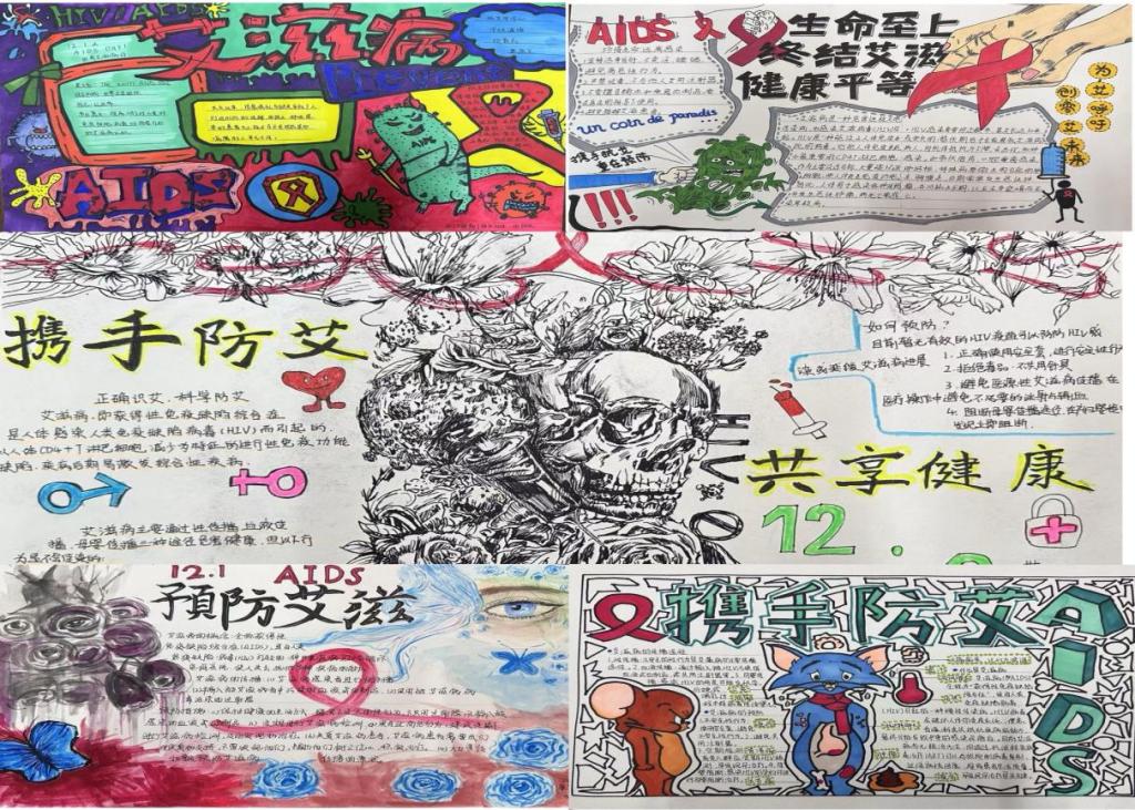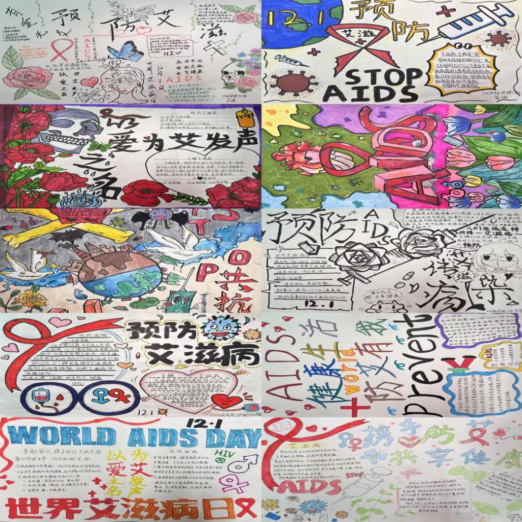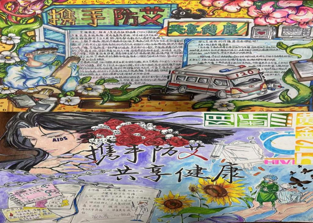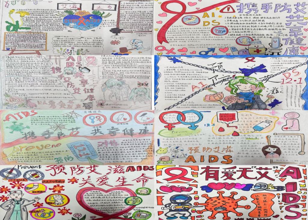 活动中,同学们的作品风格多样,色彩丰富,构图精巧,内容包含了艾滋病的定义、传播途径、预防措施等知识,体现了同学们的用心对防艾活动的支持。