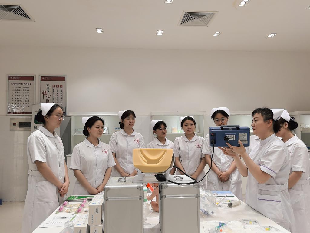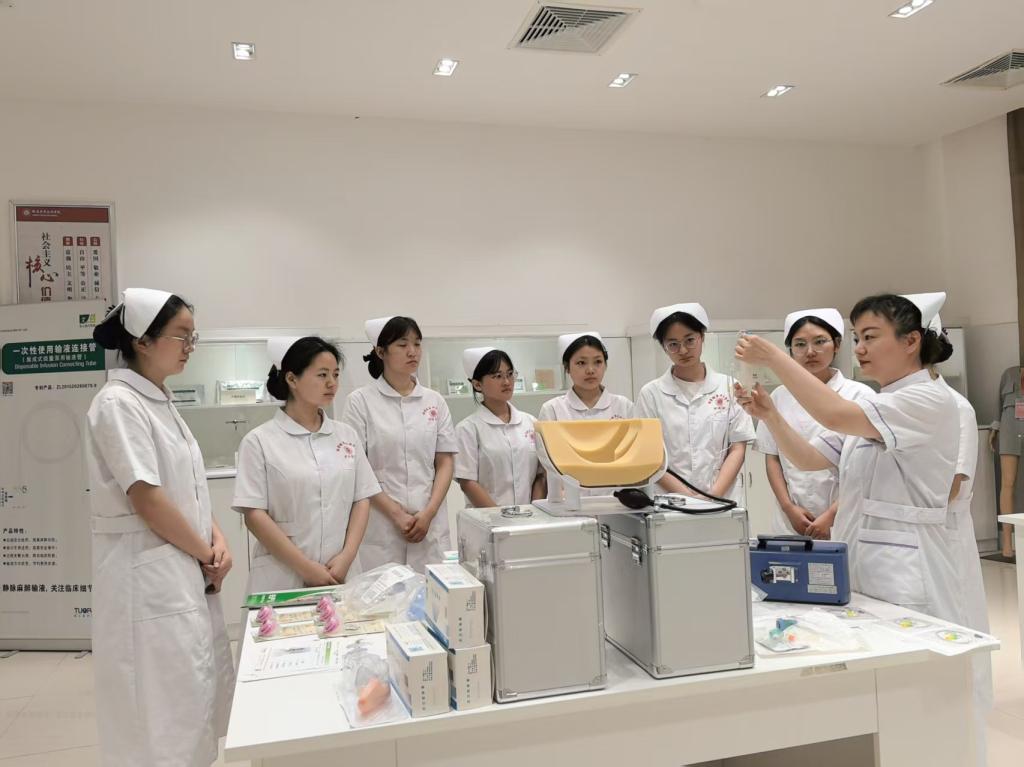 同学们走进校企共研新产品展厅,近距离观摩了当前临床护理中广泛使用的创新产品。展厅重点展示了包括婴儿奶嘴式测温计、新型留置针、安全型采血器、防针刺伤输液器、智能加压输液装置等实用型护理器械。这些产品体现了护理临床操作的人性化设计和安全性能提升的最新成果,同学们通过实物观察和模拟操作,深入了解了护理器械的创新发展和实际应用。
