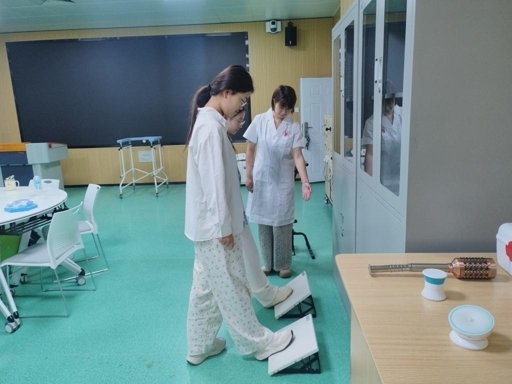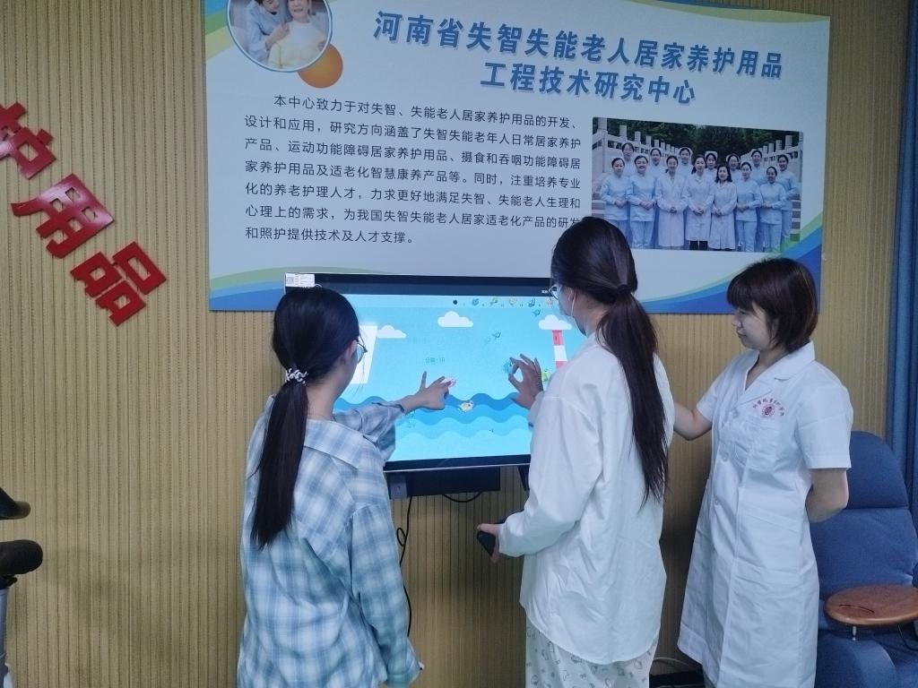 同学们走进河南省失智失能老人居家养护用品工程技术研究中心,观摩了专为失智失能老人设计的居家护理产品,包括智能防走失手环、防褥疮气垫床、助浴轮椅、防噎食餐具等实用护理器具。研究中心技术人员详细讲解了每款产品的设计理念、功能特点及临床应用场景,特别强调了"以人为本"的适老化设计理念。