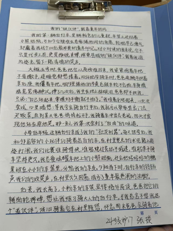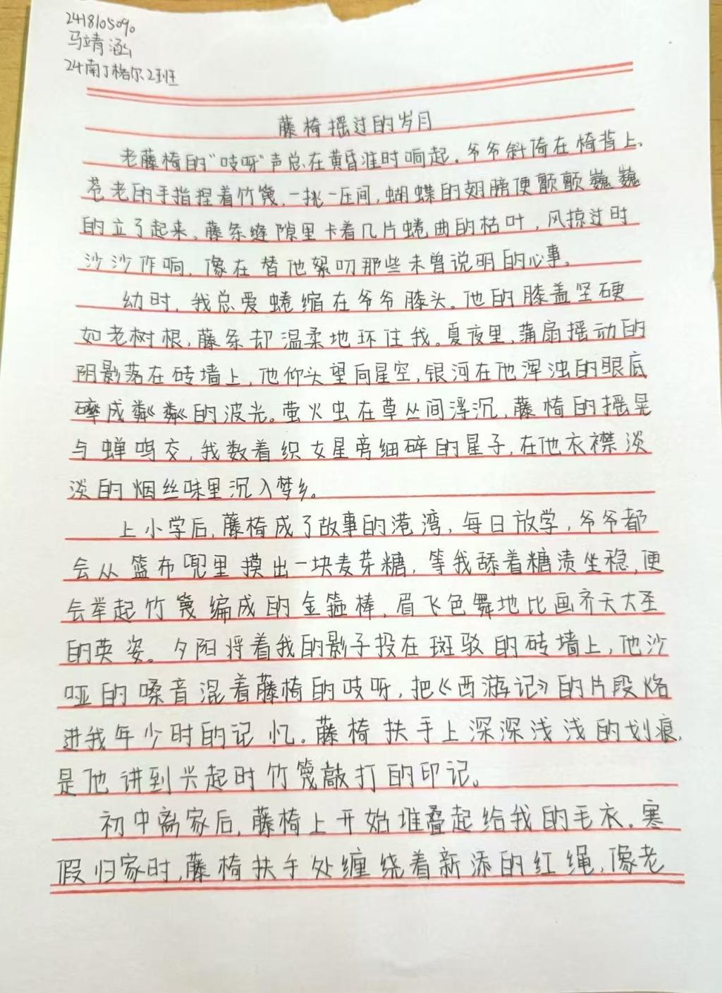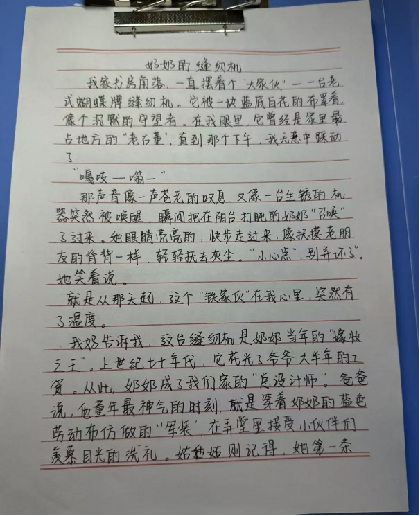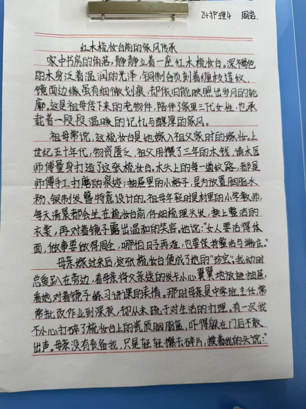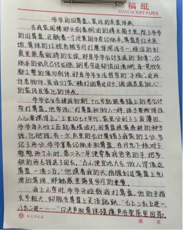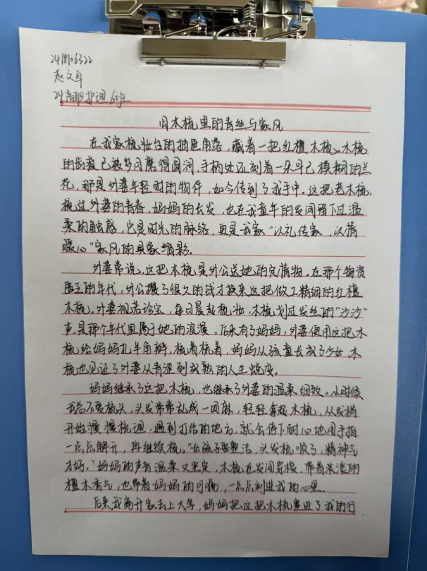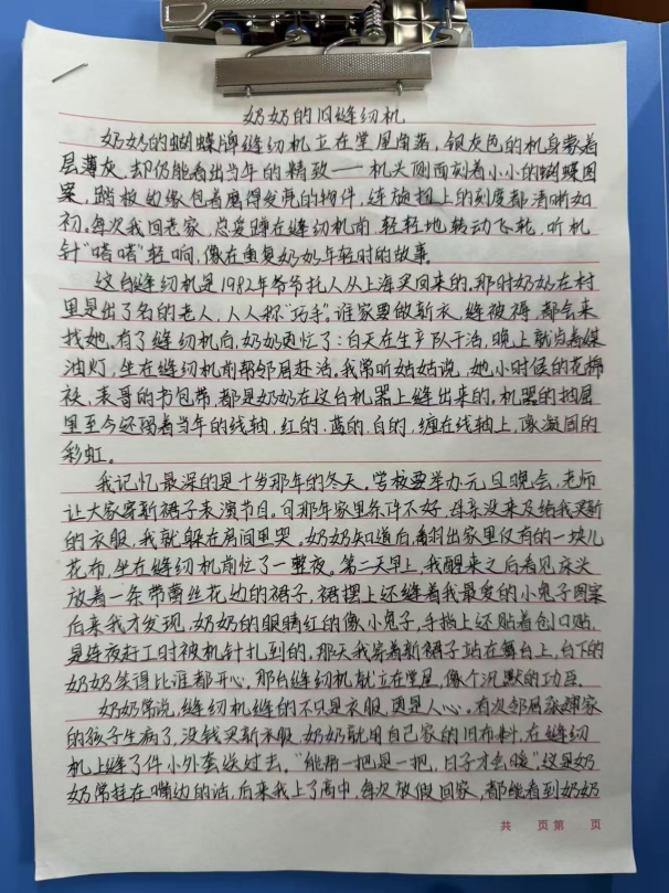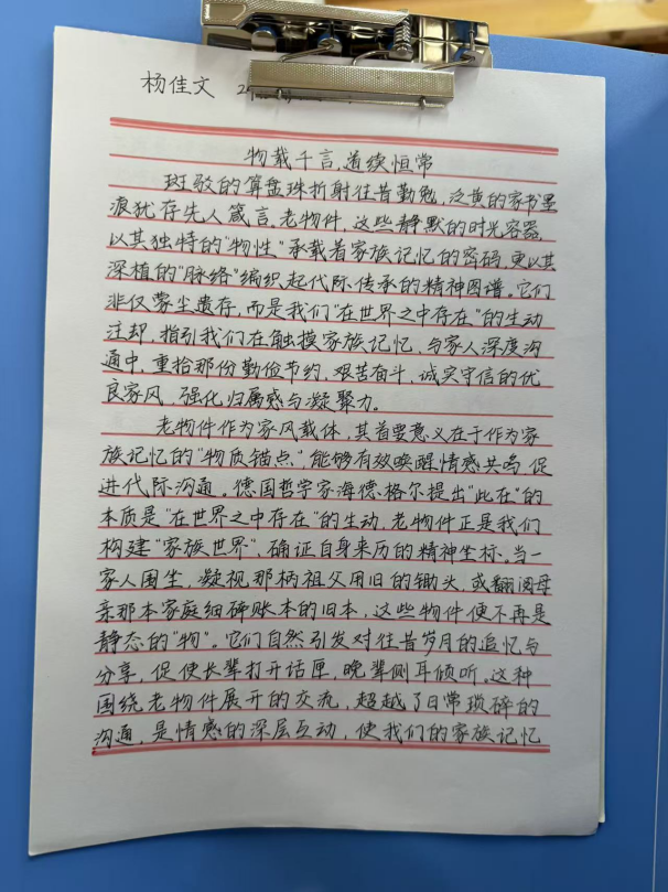 活动中,同学们围绕家中老物件,以细腻笔触勾勒岁月轮廓,书写背后的家族故事与家风传承。字里行间既有对长辈教诲的深切感悟,也有对家族变迁的温情追忆,更有对家风精神的深刻诠释。通过文字,蒙尘的老物件重焕光彩,无形的家风变得可感可触、可传可学。