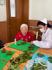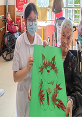 活动现场,员工第一党支部师生志愿者与养老院老人一起用树叶设计图案、剪裁、制作创意手工画,一方面让老年人感受初夏五月的美好生态,另一方面从老年护理专业领域帮助老年人提升思考和记忆能力。在师生志愿者的协助下,老年人收获了自己的创意作品。
