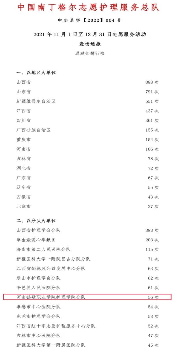 正是志愿者们接力前行,才使志愿服务成为一面引领同学成长、进步的精神旗帜。目前,南丁格尔志愿护理服务分队活跃度在全国805支队伍中排名第二,1月26日,再次被南丁格尔志愿护理总队选入月刊“爱的集合”和“团队表彰通报”,成绩显著。