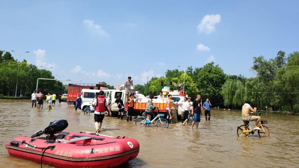 20级ICU班张世乙,7月24日在洛阳市嵩县滨河公园参与抗洪救灾志愿者服务活动,为受灾群众集中搬运救援物资。