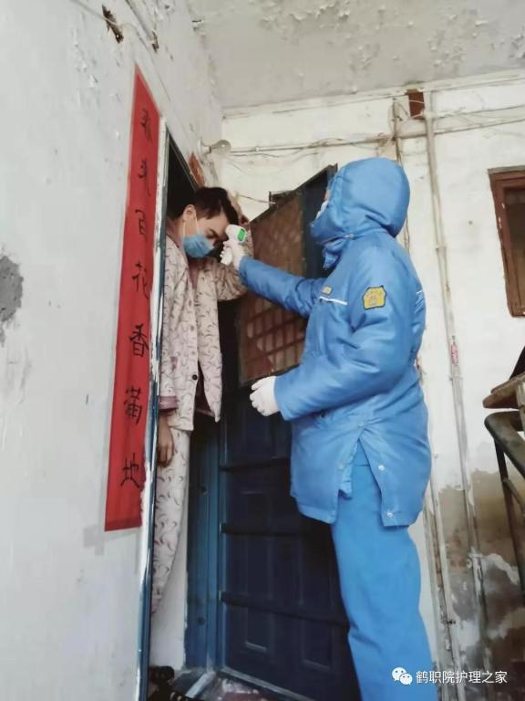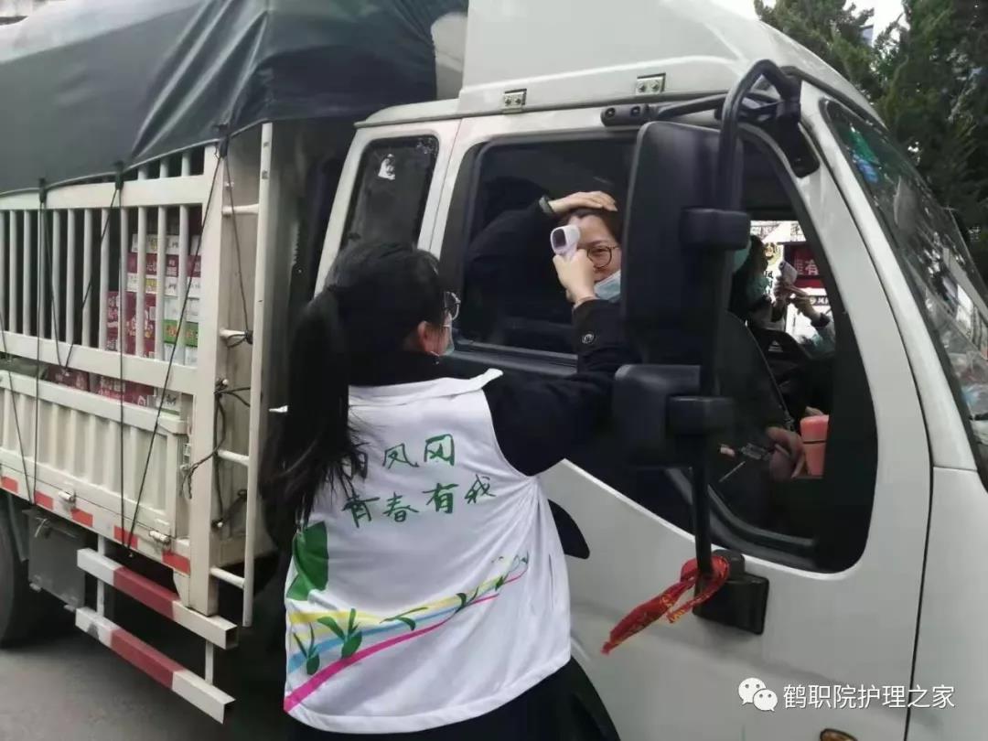 18级护理16班任梦瑶在新乡市卫辉市孙杏村镇大任庄村疫情防控卡点给外来人员消毒,测量体温,登记外来人员信息。