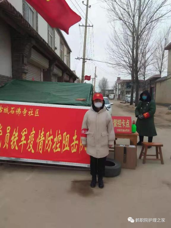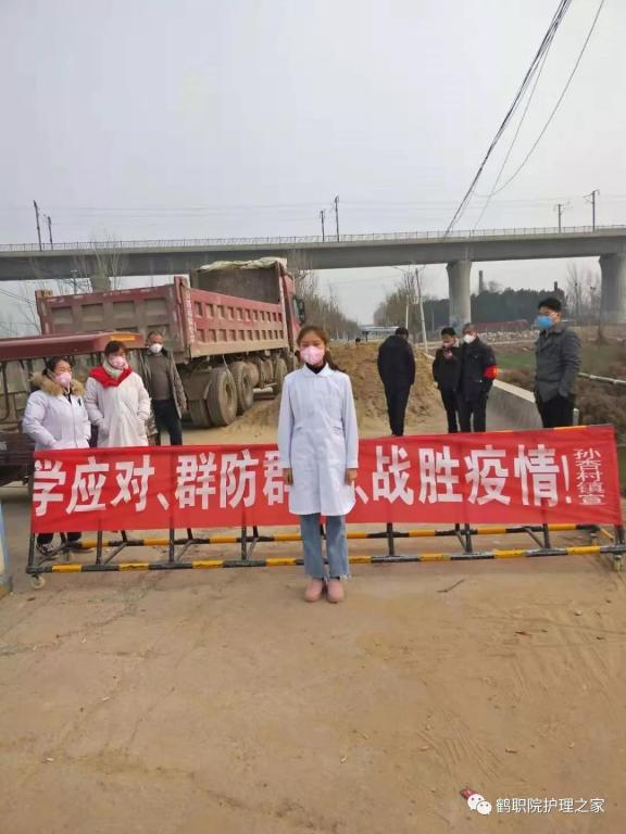 18级护理1班缑文娟在河南省安阳市滑县焦虎镇缑庄村口参与关于“新型冠状肺炎”卡点执勤的行动。旨在防止人群往来,具体为对进入者进行体温测量,严禁非本村人员进入。抗击疫情,贡献自己的微小力量,村口护航!