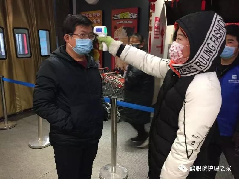 19级护理3班段婉晴在安阳市滑县圣君超市给外来人员测体温 。