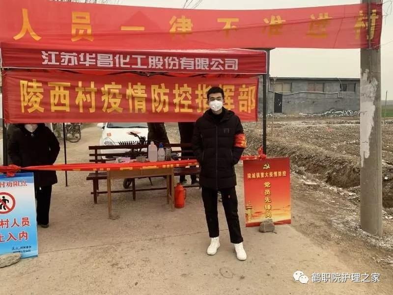 19级护理3班陈明辉在济宁市曲阜市陵城镇陵西村疫情防控卡点给外来人员消毒,测量体温,出入人员做登记信息。