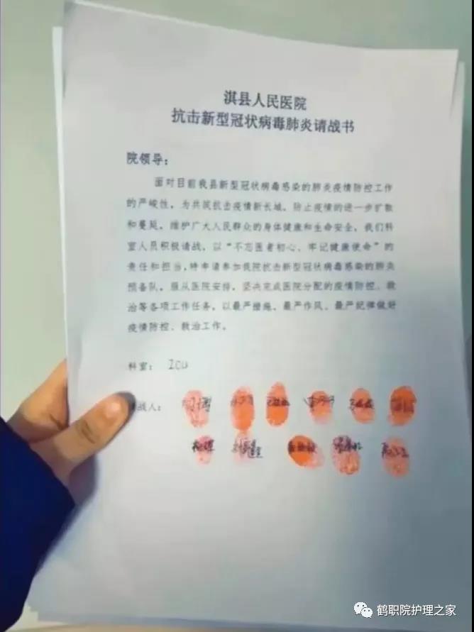 2010级护理五年制二班刘鑫鑫,在淇县人民医院重症病房递交请战书,主动请缨到抗击疫情最前线。