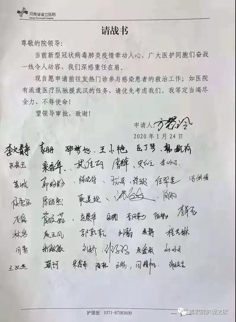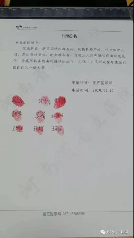 2015级ICU1班李肖杰,在河南省省立医院护理部,递交请战书。