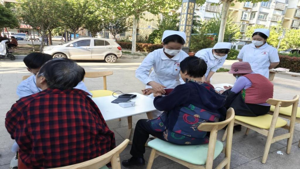 在社区工作人员的帮助下,利用社区小广场为居民开展服务活动,同学们引导老人有序 进行血压测量,并认真记录每位测量者的血压数据,在测量血压的过程中,志愿者们还积极向居民们普及健康知识,讲解高血压的危害以及预防和控制高血压的方法。面对带孩子的家长, 师生以生动有趣的方式向家长与孩子们介绍海姆立克急救法。在活动现场,两名同学一组模拟演示成人海姆立克急救法的操作步骤,还利用婴儿教具,模拟异物卡喉场景,详细讲解并演示婴儿海姆立克急救法的操作流程。家长们热情高涨,积极参与互动,在轻松愉快的氛围中学会了这一重要的急救技能。