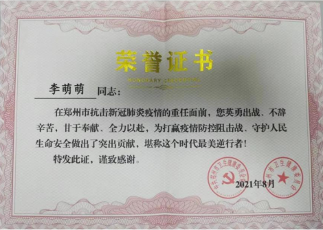 李萌萌,女,30岁,系bw必威西汉姆联官方网站2014届毕业生,2014年12月考取郑州大学自考本科,现就职于郑州大学第一附属医院。2019年12月新冠病毒疫情爆发以来,多次参加郑州市新冠病毒核酸采集采样工作;2021年8月支援救治郑州市航空港区第一人民医院隔离病房患者;2022年1月安阳市爆发疫情,支援救治转运到郑州市岐伯山医院的隔离病房患者;2022年4月参加河南省援沪医疗救治队,支援上海抗疫救治工作。先后荣获郑州市二七区疫情防控志愿者证书、郑州大学第一附医院年度抗疫先进个人、郑州市抗疫最美逆行者荣誉证书、郑州市抗疫英雄奖杯、安阳市终身荣誉市民证书及首战奥密克戎终身荣誉市民奖杯、上海市浦东医院复旦大学附属浦东医院抗击疫情纪念证书等多项荣誉。